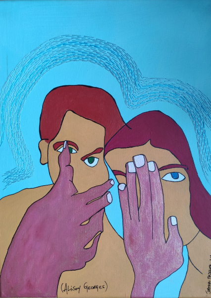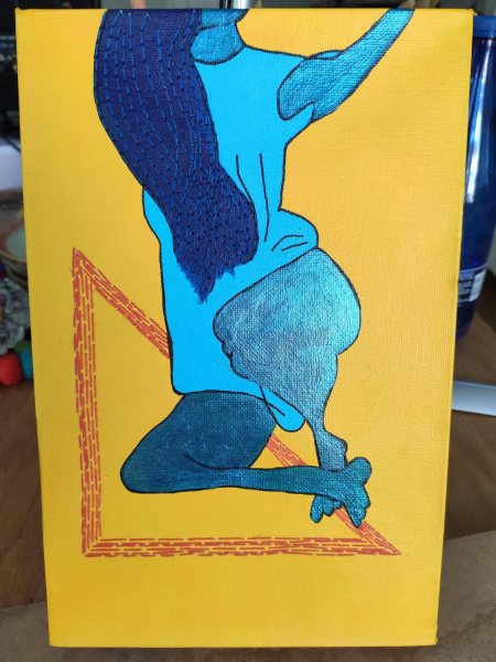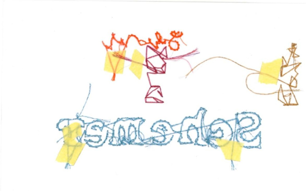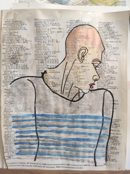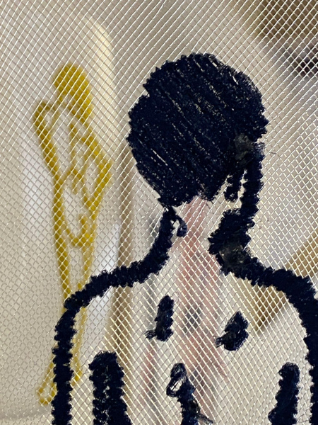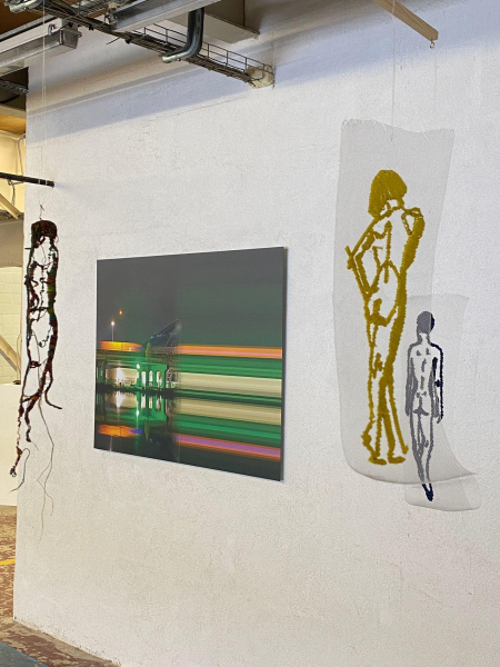 (queer love drawing) - sketches of human bodies embroidered on a transparent background with wooden plinth and concrete base