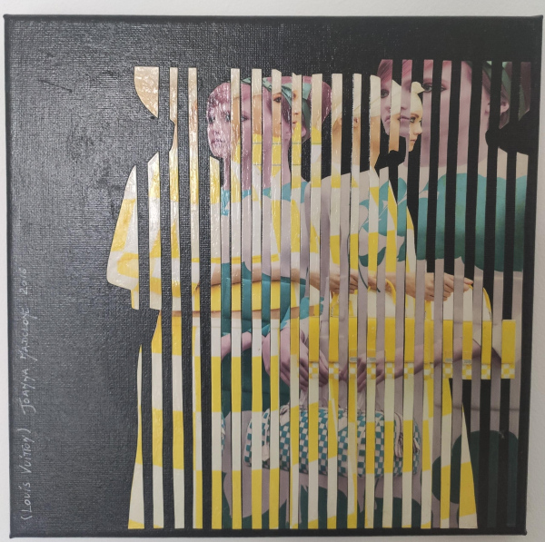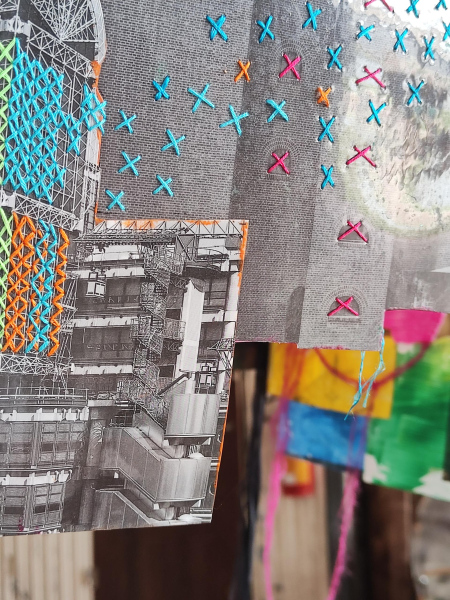 collage of 20th-century architecture photographs, embroidery, metal, acrylic, paper and other materials